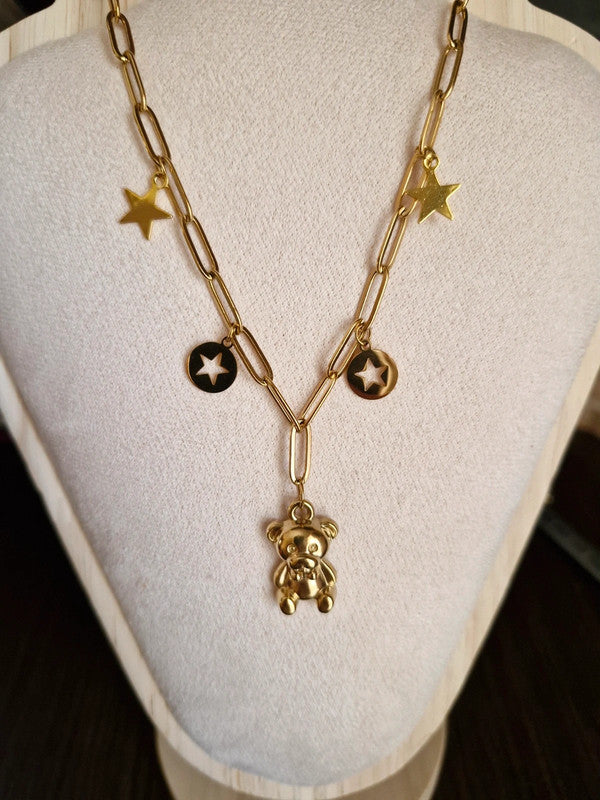 Ατσάλινη επιχρυσωμένη αλυσίδα με κρεμαστά αστεράκια και αρκουδάκι.