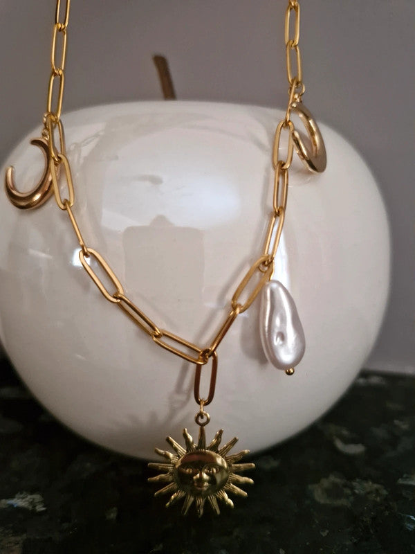 Ατσάλινη επιχρυσωμένη αλυσίδα με ατσάλινο ήλιο, φεγγάρι και πέρλα