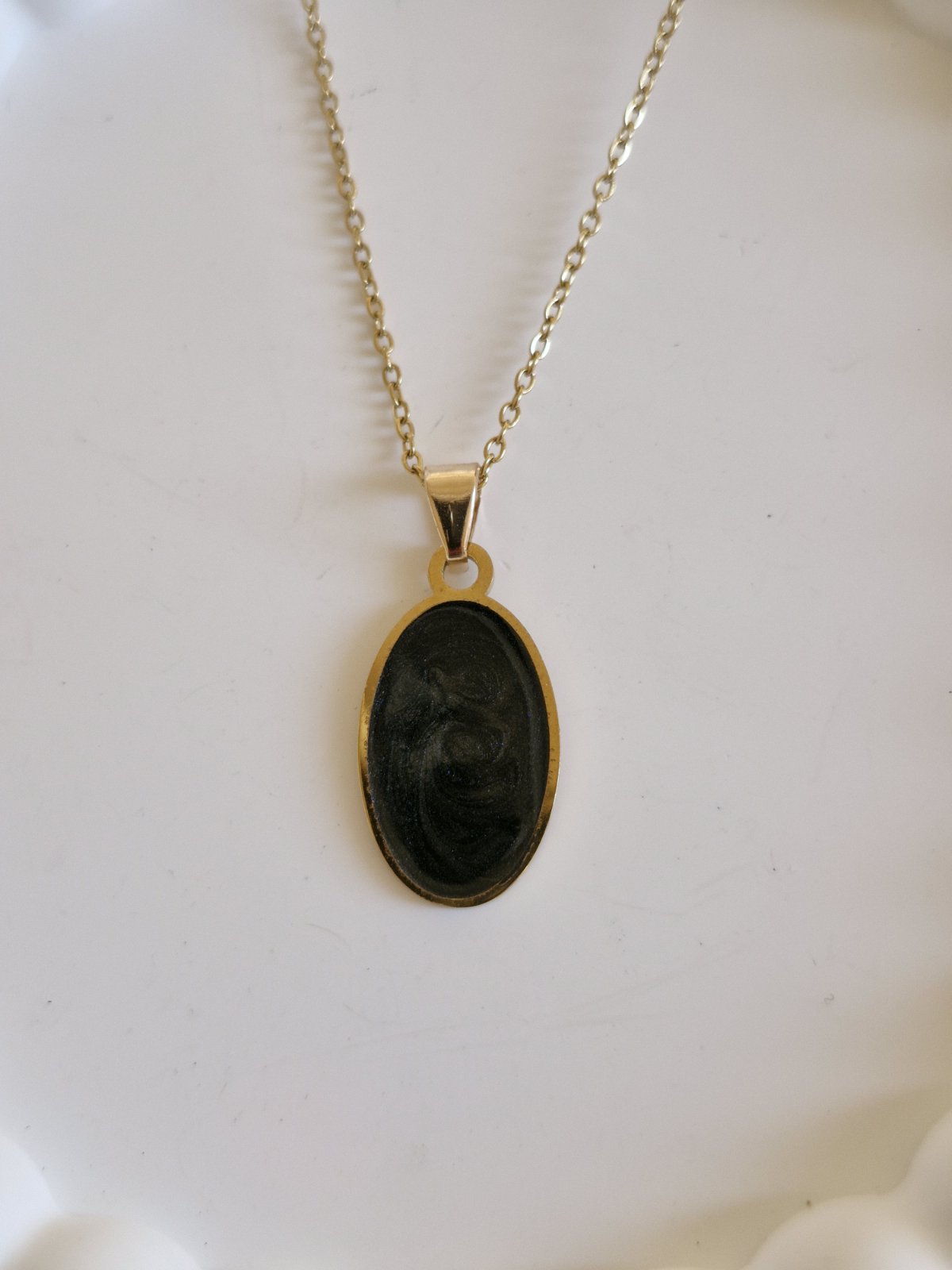 Ατσάλινη επιχρυσωμένη αλυσίδα με οβάλ κρεμαστό σε μαύρο χρώμα με νερά.