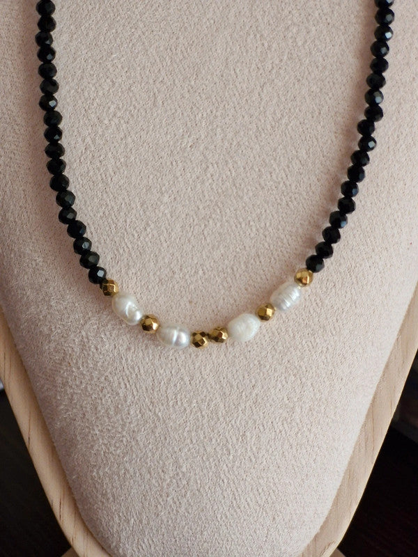 Ατσάλινο κολιέ αποτελούμενο από μαύρες γυαλιστερές χάντρες, αιματίτη και μαργαριτάρια.