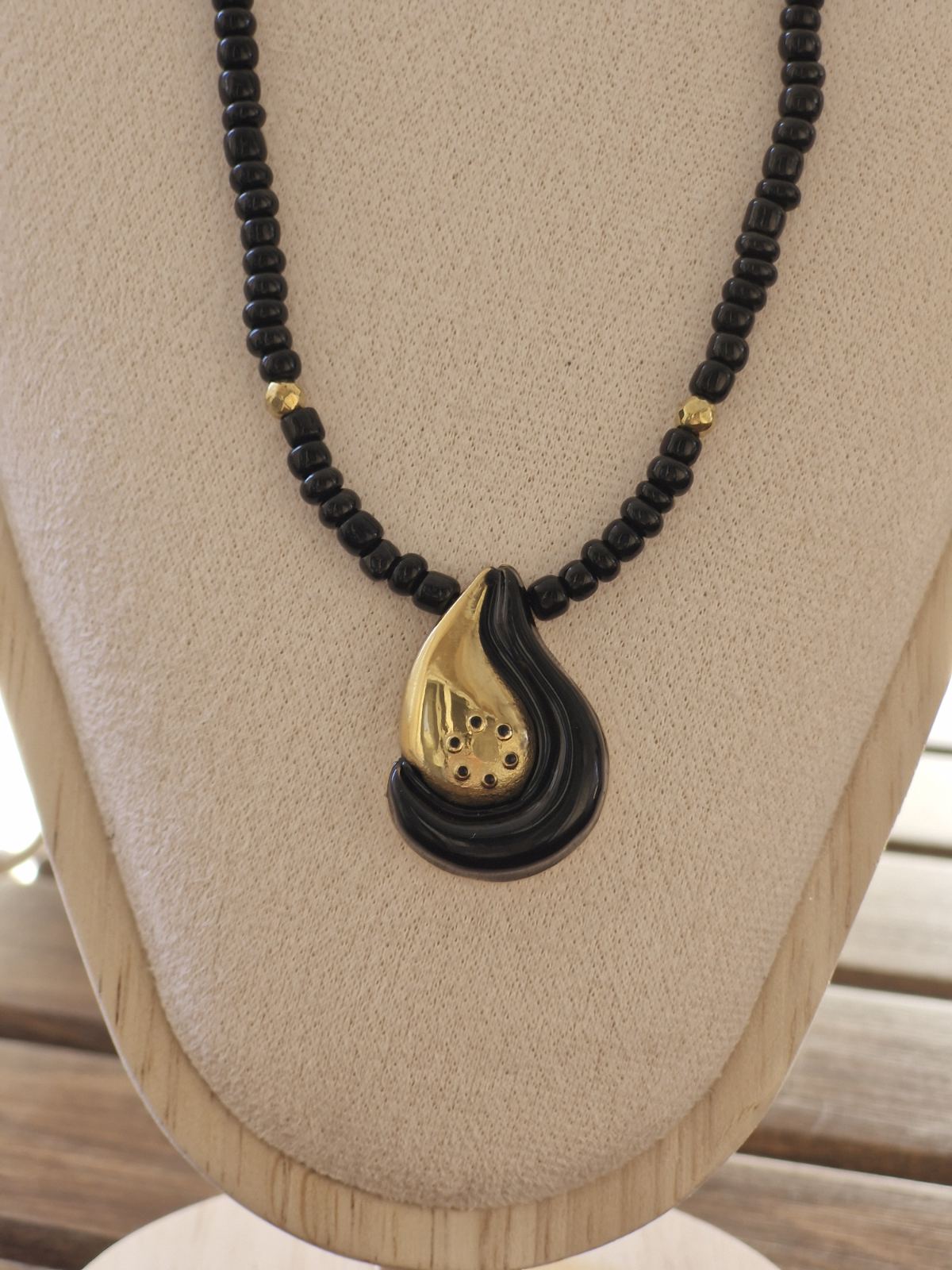 Ατσάλινο κολιέ αποτελούμενο από μαύρες χάντρες, αιματίτη και ατσάλινο κρεμαστό 3D μάτι χρώματος μαύρο και χρυσό.